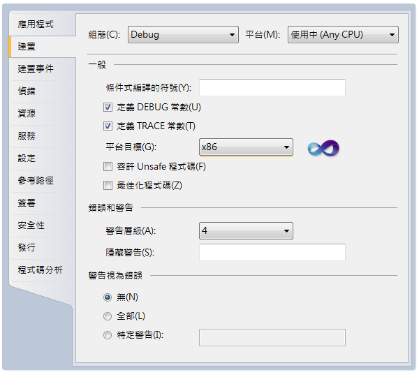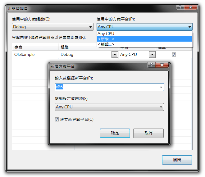 方案组态 组态管理员 预设有「Debug」和「Release」两种组态预设的平台「Any CPU」。修改为「x86」于「使用中的方案平台」下拉选单,选择「新增」再于「新增专案平台」对方话块中「输入或选择新平台」选「x86」。如果在 x64 平台上以 x86 方式执行程式,无法运用 x64 所特有的功能。